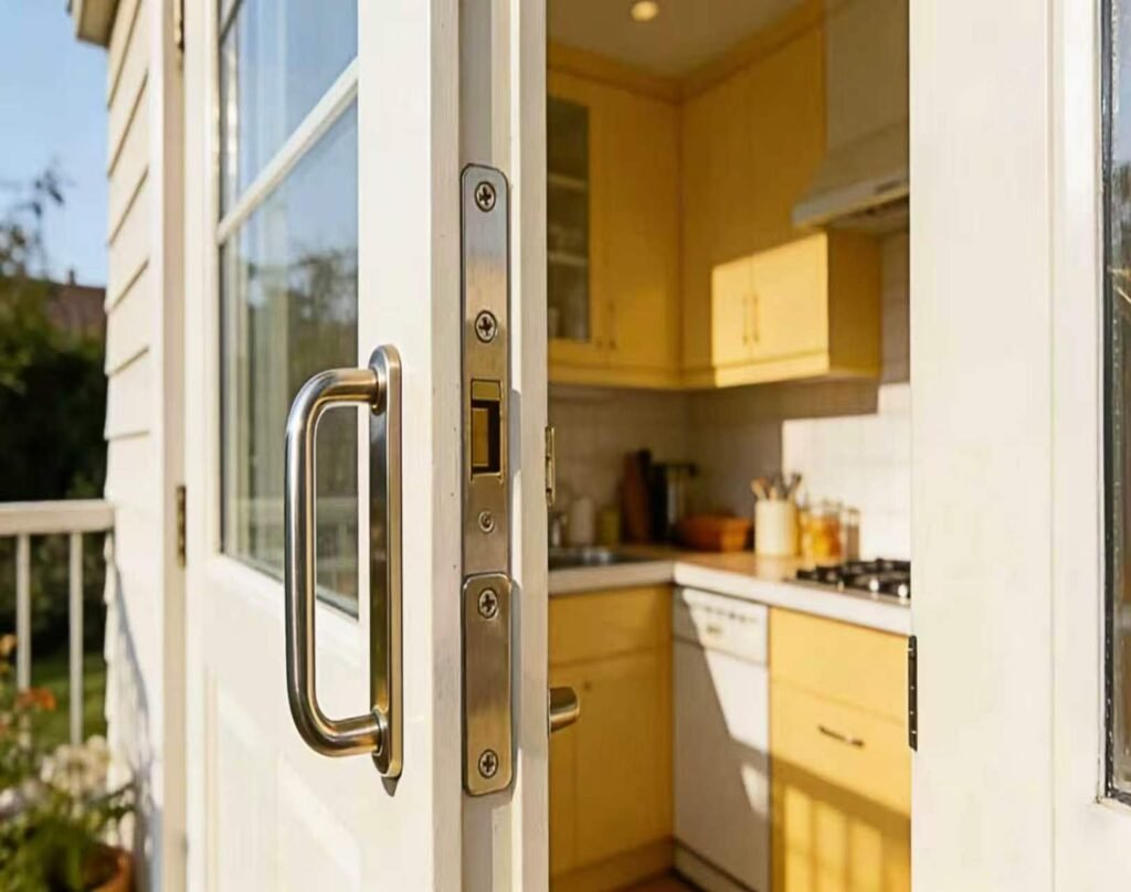 High-quality door and window fittings like magnetic stoppers and friction stays. Ensuring security and modern aesthetics.