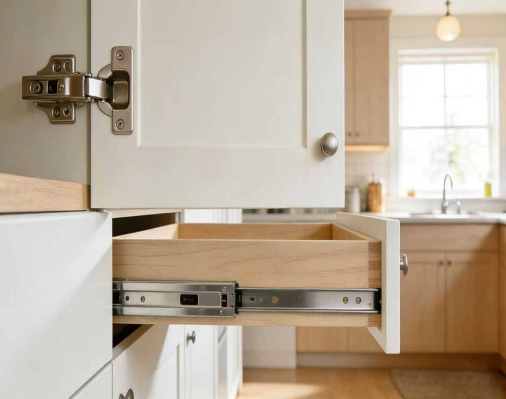 Premium kitchen hardware including soft-close hinges and heavy-duty slides. Engineered for durability and smooth operation.